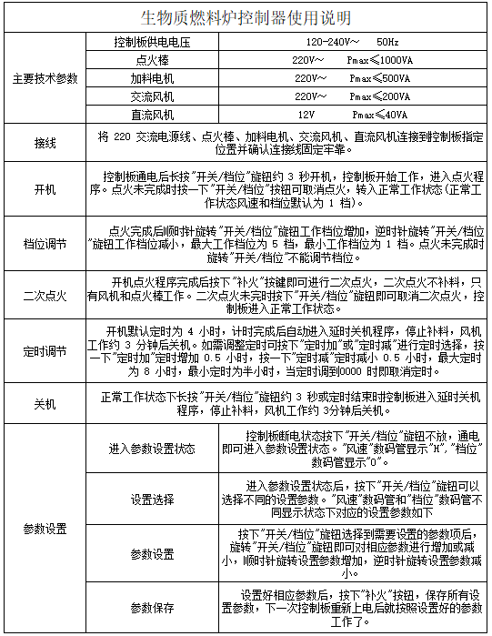 我公司獨家研發(fā)生產(chǎn)的生物質(zhì)燃料爐控制器內(nèi)置開關(guān)電源,適應(yīng)電壓范圍廣,工作更可靠,操作更簡單。自動送料,可外接直流風(fēng)機(jī)和交流風(fēng)機(jī),不同檔位的風(fēng)力大小以及送料的多少都可以自行設(shè)置,內(nèi)置定時功能,可以根據(jù)不同需要設(shè)置關(guān)機(jī)時間,直接燃燒生物質(zhì)顆粒,可替代燃煤﹑燃油﹑瓦斯﹑用電等方式加熱或取暖,是以新型綠色環(huán)保顆粒為原料,解決家庭及中小型企業(yè)單位用煤用電緊缺之急。